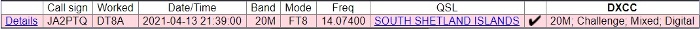 DT8Aは時折出ていますね。私は最初韓国の記念局か。試しにやっておこっとくらいに思ってQSOしました。ところが『えっ、S. Shetland Is.』でした。私は95年にVP8CQSを40CでCfmしてましたので、今回の20FはTnxでした。